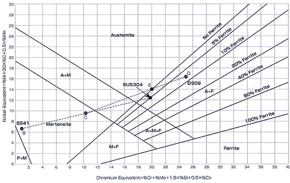 図1のようなステンレス鋼SUS304(18Cr-8Ni)と軟鋼(SS41)の異材溶接D309溶接棒を用いて継手溶接を行った場合、図2にあるシェフラーの状態図により、溶接金属の組成を推定することができます。