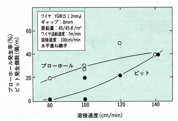 図6は、重ねすみ肉継手における、溶接速度と気孔発生の関係を示したものです。溶接速度が早くなるほど気孔の発生が増加する傾向が認められます。