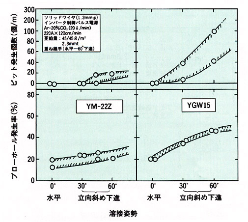 図9は、YM-22Zの耐気孔性を示しますが、いずれの溶接姿勢においてもピット、ブローホール発生共に、従来ワイヤ(YGW15系)に比べて少ない特性が得られています。