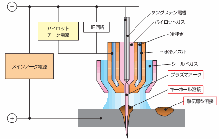 プラズマ溶接は図1に示すように、水冷チップを介してプラズマ気流中をタングステン電極から母材にアークを移行する非消耗式溶接法です。プラズマアークは、水冷チップで収束されるため、高熱エネルギー密度アーク溶接となり、突合せ溶接ではTIG法と比して、約1.5~4倍の溶接速度が得られ、ひずみの少ない高品質溶接ができます。