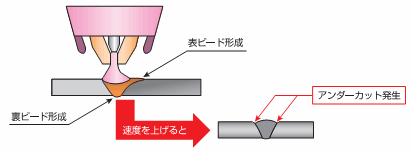 図2の模式図に示すように、従来のプラズマ溶接では、適正溶接速度を超えるとビード両端にアンダーカットが発生します。このアンダーカットの発生が、高速溶接化の課題でした。