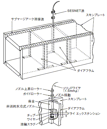 建築鉄骨における溶接では、主にスチールバッキングを使用した片面溶接法が採用され、この分野でもガウジングレス施工法が適用されています。溶接法としては、ソリッドワイヤによるガスシールドアーク溶接、サブマージアーク溶接と一部エレクトロスラグ溶接法が主として適用されています。四面ボックス柱の角溶接にはサブマージアーク溶接が適用され、ダイアフラムとスキンプレートの溶接には、当社が開発した簡易エレクトロスラグ溶接法(SESNET法)が適用されています。なお、エレクトロスラグ溶接法とは溶融スラグに電流を流して発生する抵抗熱を利用してワイヤ及び母材を溶融させる溶接法であり、アーク溶接法とは原理が異なります。四面ボックス柱における溶接施工例を図6に示します。