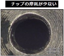 また、耐チップ摩耗性についても、写真1に示すように100分間溶接後のチップ摩耗量は、市販FCWの約3分の1程度と非常に少ない(チップ寿命が長い)ため、チップ交換の頻度が少なく、長時間の溶接でもチップ摩耗によりアーク状態が不安定化する心配が軽減します。