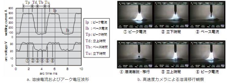 図1 パルスマグアーク溶接における溶接波形と溶滴移行の観察